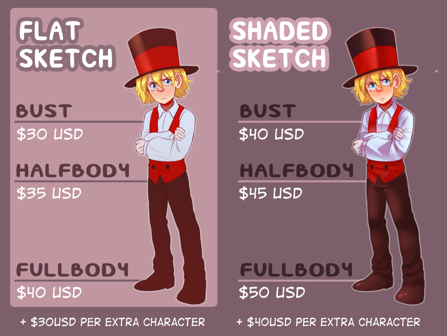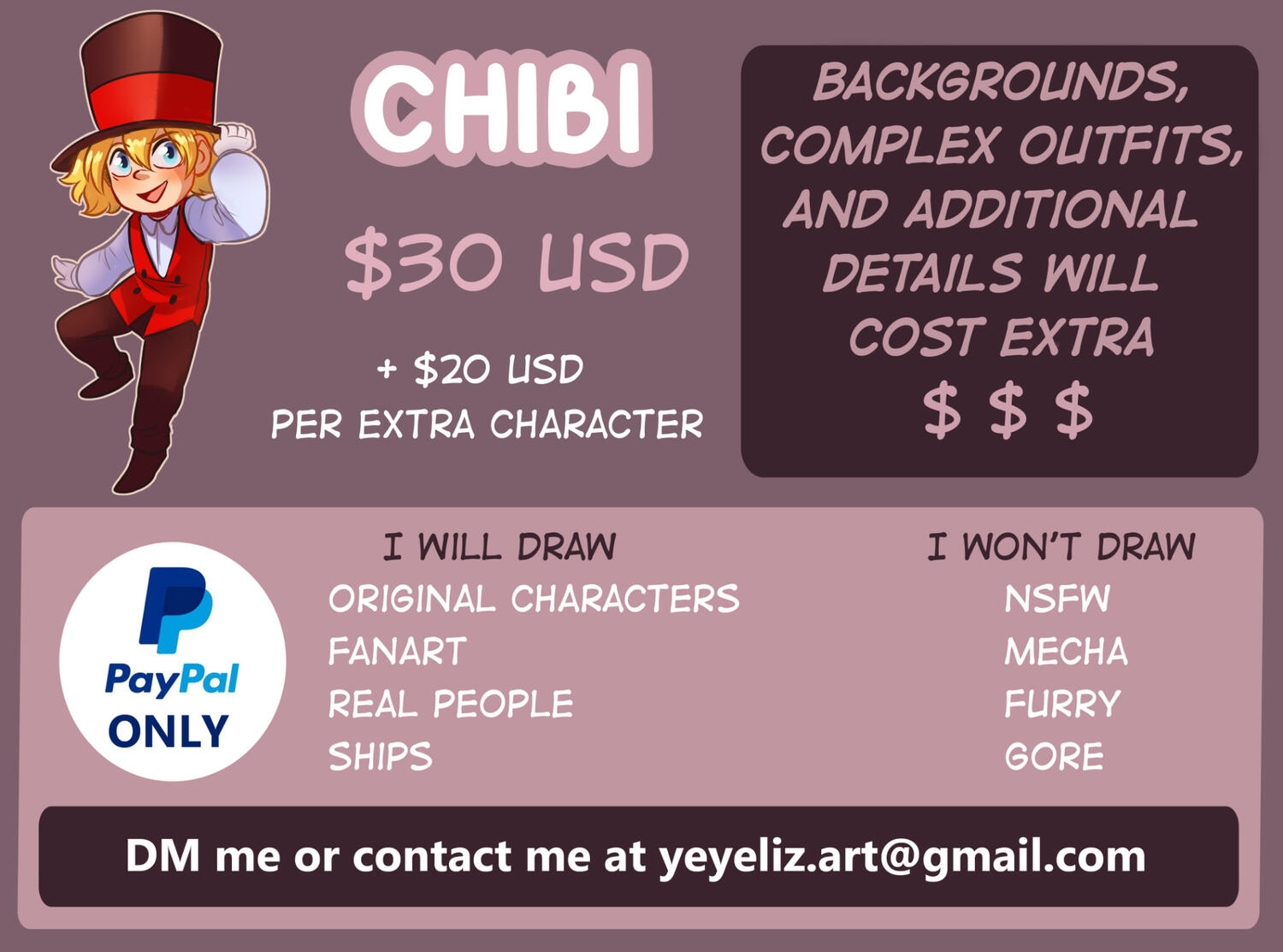 I'm a digital artist, focused on character design and illustration in a variety of styles and coloring techniques. Prices and examples below.If you're interested in getting a commission, whether for personal or commercial use, feel free to send me an email and we can discuss it further.